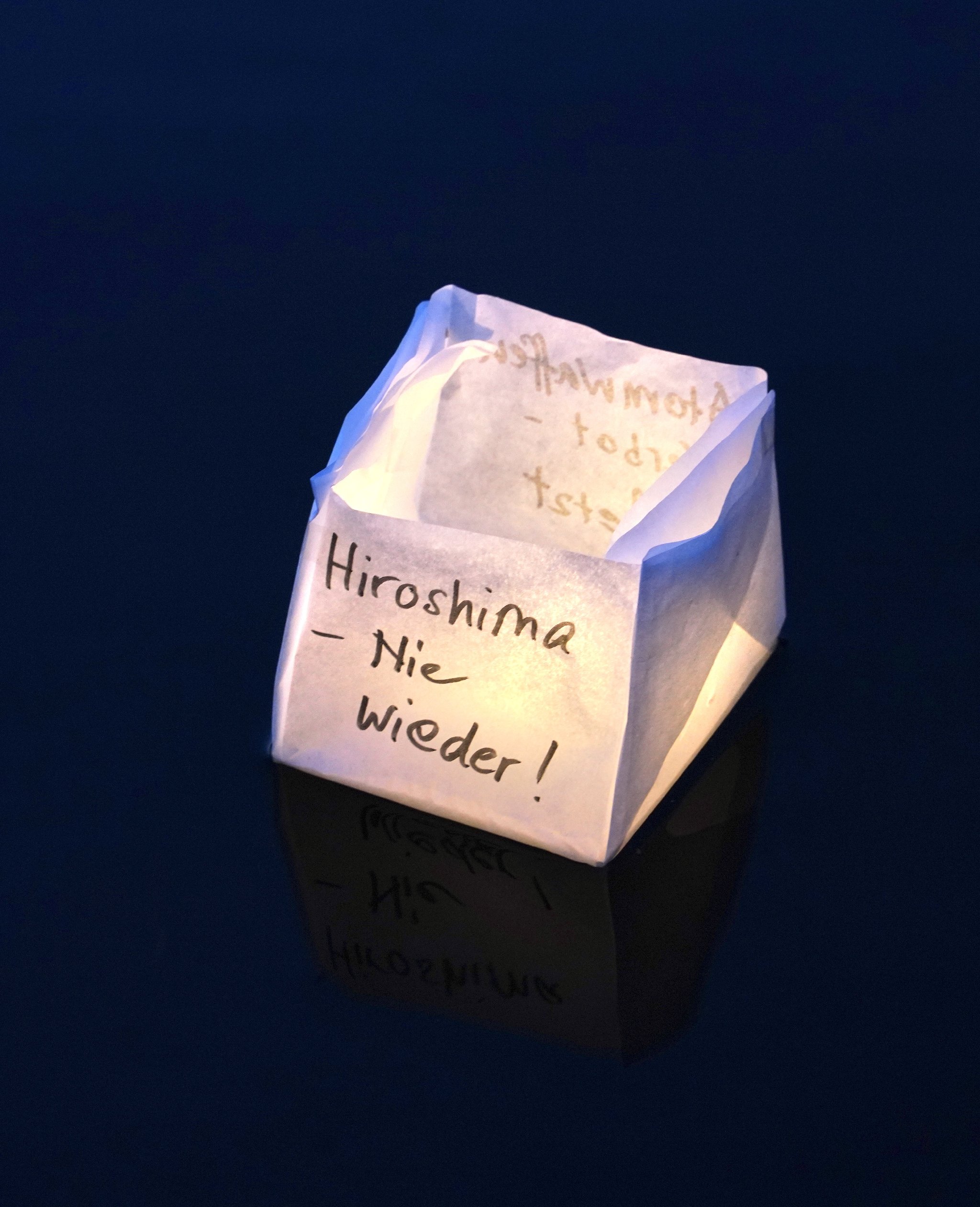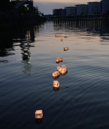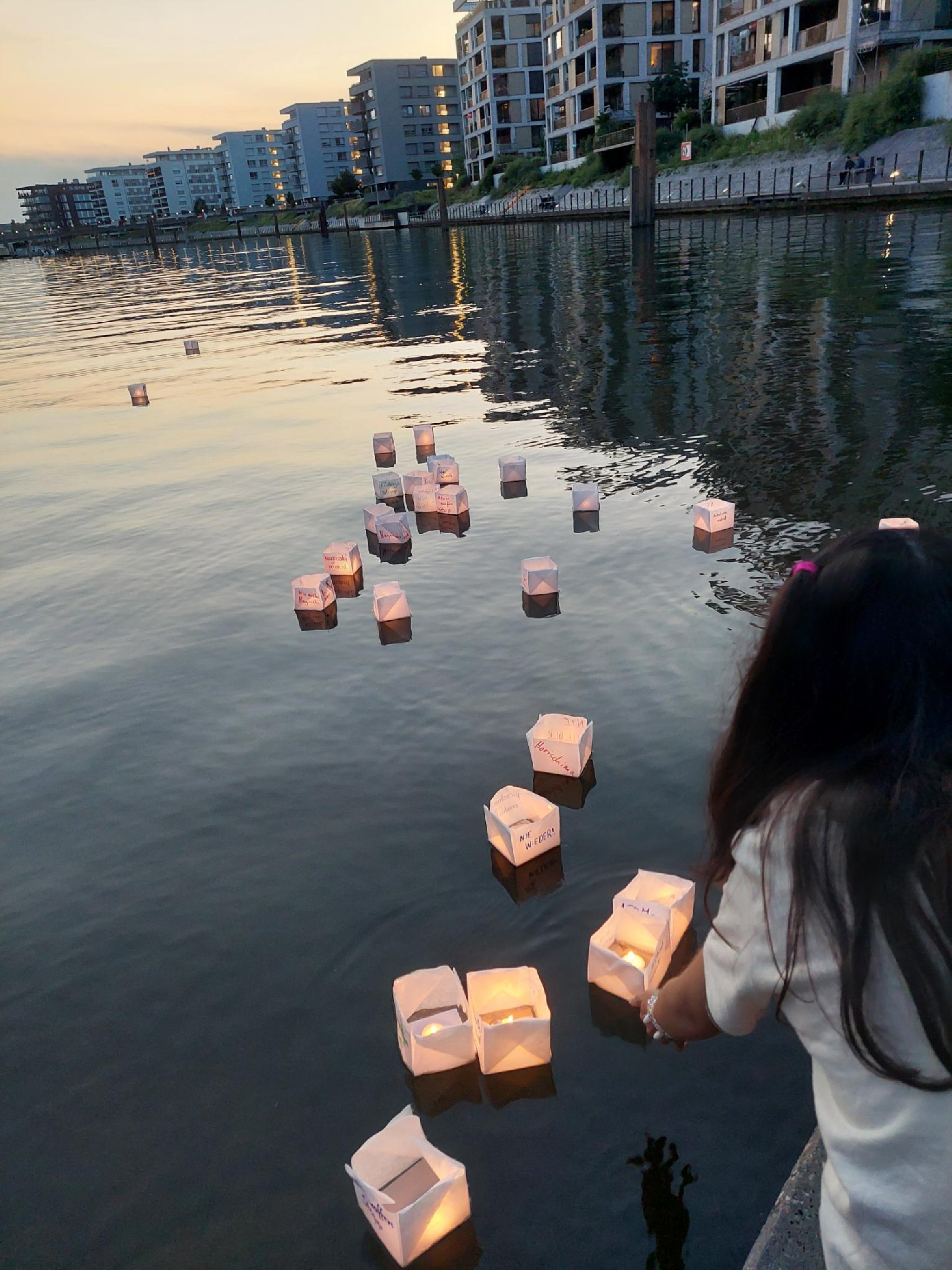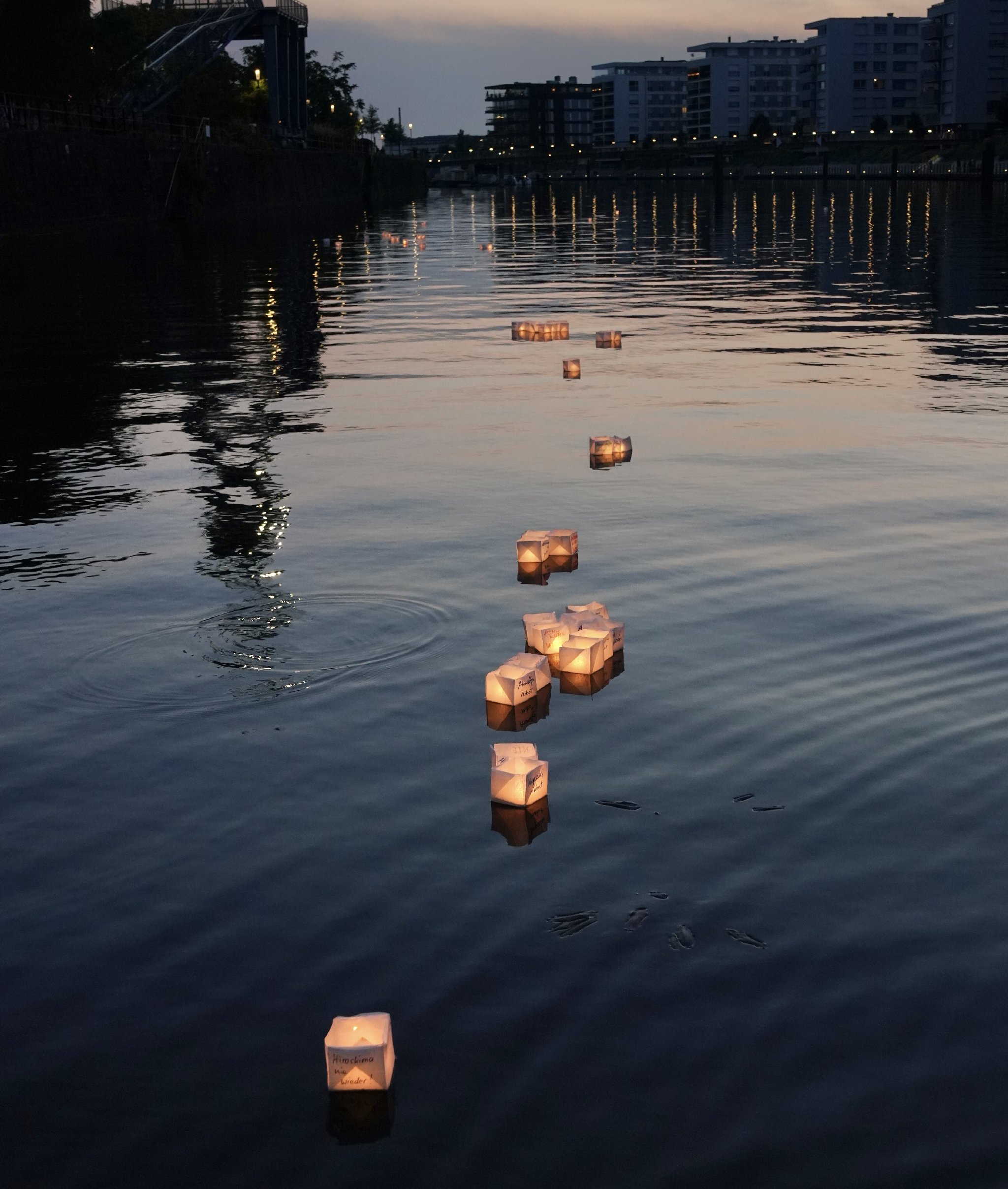 Noch zum günstigen Wind: die Lampions, die wir zum Gedenken an die Opfer ins Wasser setzten, wie das auch in Japan Brauch ist, trieben diesmal weit hinaus. Es verweilten viele, begleitet von den Klängen von Richards Improvisationen auf dem Klavier.