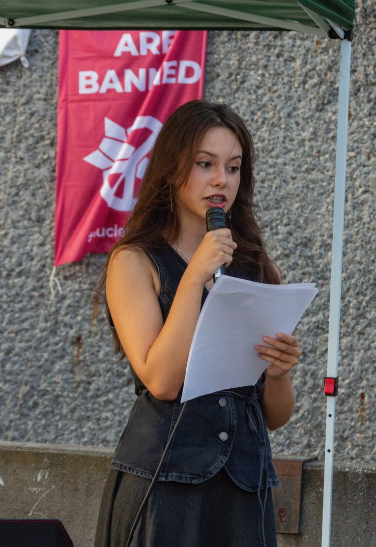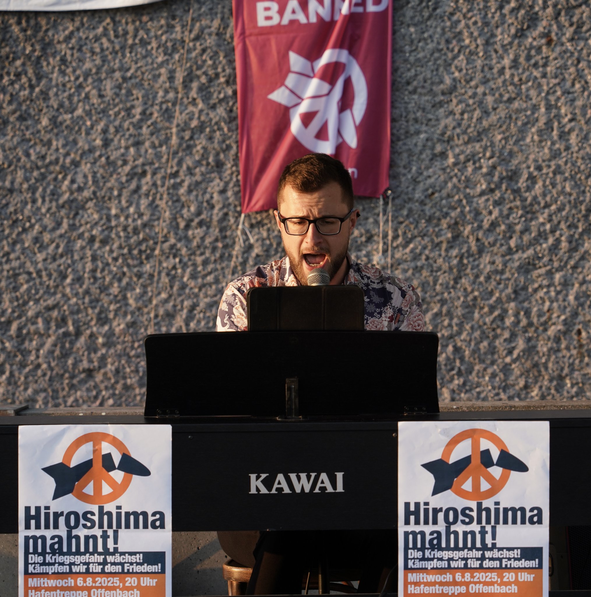 Sara Muratovic (Kinder- und Jugendparlament der Stadt Offenbach) legte den Schwerpunkt auf die Lage von Kindern und Jugendlichen, damals im Inferno von Hiroshima und heute. Sie forderte eine friedliche Zukunft ein, ohne die Bedrohung durch Atombomben. Wie ihre Vorrednerin forderte sie ein Verbot der Atomwaffen. Deutschland muss endlich dem Atomwaffenverbotsvertrag beitreten.