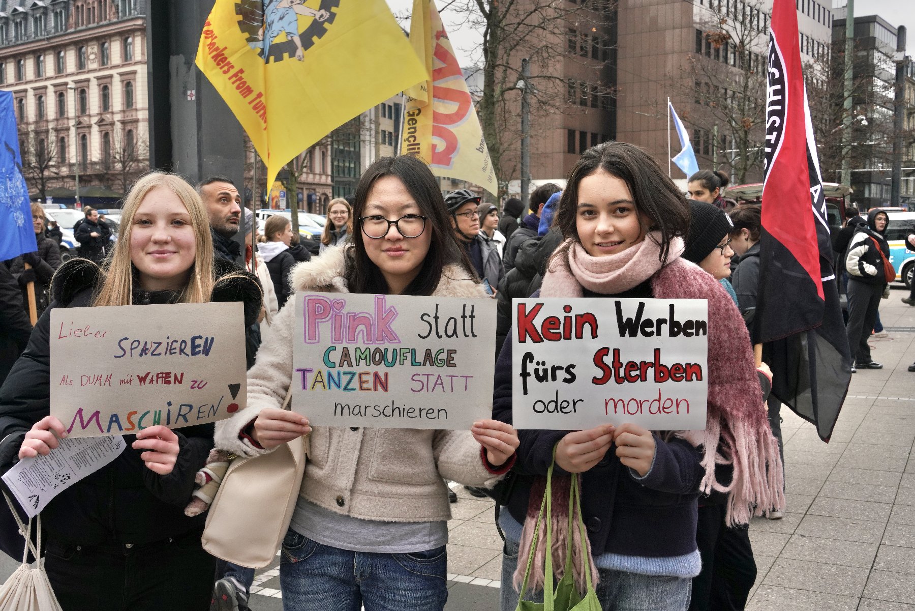 Einzelne Redner hoben hervor, dass das Geld, was für die Aufrüstung ausgegeben wird, im Sozialbereich und dem Umweltschutz fehlt. Sie forderten mehr Personal in sozialen Einrichtungen wie Kitas, Schulen, Heimen, Krankenhäusern. In einer der Reden wurde hervorgehoben, wie lukrativ der Krieg für die Rüstungsindustrie, IT-Branche und natürlich die Banken ist. Eine Schülerin berichtete über die Vor-Ort-Situation in einer Schule, deren Schüler daran gehindert werden sollten, zur Demo gegen Wehrpflicht zu gehen. Ein anderer Schüler listete auf, wo Kriege aus Interesse an Rohstoffen und Machtausweitung geführt werden. Zuerst verunsichert, dann immer mutiger legte ein junger Mann dar, was es für Menschen heißt, aus ihrem Lebenslauf herausgerissen und den Interessen von Politikern und Unternehmen geopfert zu werden. Zwei mutige 12-jährige Mädchen waren dem Unterricht ferngeblieben, weil sie sich über das Kinderschutz-Gesetz informiert hatten. Sie erinnerten an die Aufgabe der staatlichen Gemeinschaft, “das Wohl von Kindern und Jugendlichen zu schützen und ihre körperliche, geistige und seelische Entwicklung zu fördern.” (KKG, §1) Ein eloquenter Jugendlicher riss alle mit sich, Zivilcourage zu zeigen und sich dafür einzusetzen, dass durchgesetzt wird, was laut einer Umfrage an 5 Frankfurter Schulen, 74 bis 89 % aller Schüler fordern: