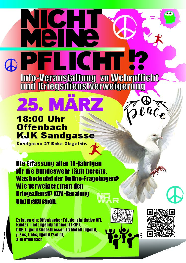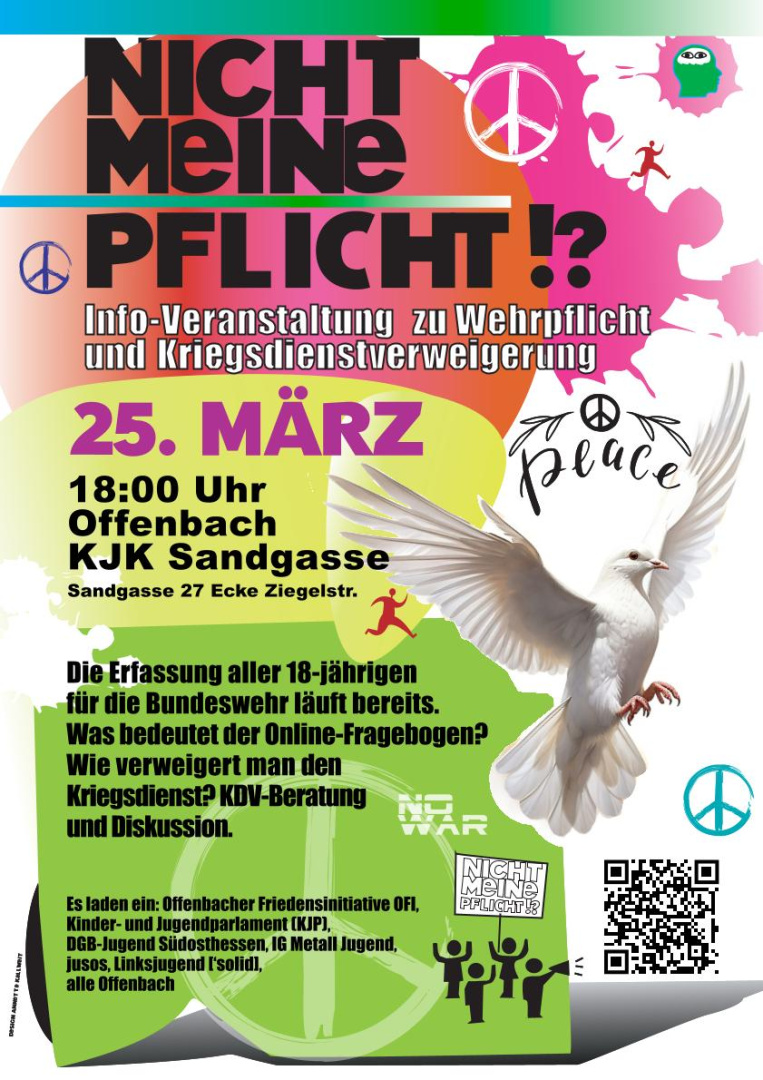 Die Frage stellen sich alle jungen Leute unter 18 und ihre Eltern jetzt verstärkt. Viele denken daran zu verweigern. Wer Fragen hat zu den Möglichkeiten dazu, ist auf unserer Veranstaltung richtig. Jörg Rode berät bei der DFG VK und ist aktiv für den Aufbau eines Netzes von Beratungsstellen. Er wird berichten und stellt sich den Fragen.